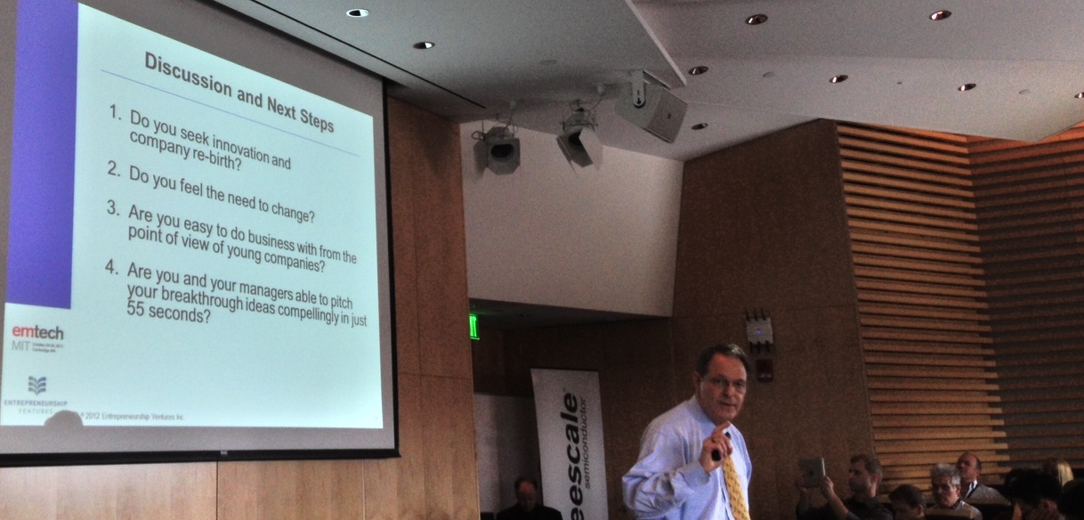This past week, I spent a handful of high-quality hours at the EmTech MIT 2012 technology innovation conference. The kind of cutting-edge work people are doing these days is utterly mind-blowingly delightful, and the sort of innovation advice (with a hefty dose of humor) from experts like Ken Morse is greatly valuable (image on the left from his session). I wish people outside venues like EmTech could get a glimpse of how amazing things like pop-up book microscale manufacturing and Lytro cameras are—more of a glimpse than is offered by magazines like Technology Review (which organizes EmTech), Scientific American and WIRED. They do a great job, but there’s a raw, awe-inspiring power to hearing innovators talking passionately in-person about moving their ideas into realities. That should be part of public-school curricula.