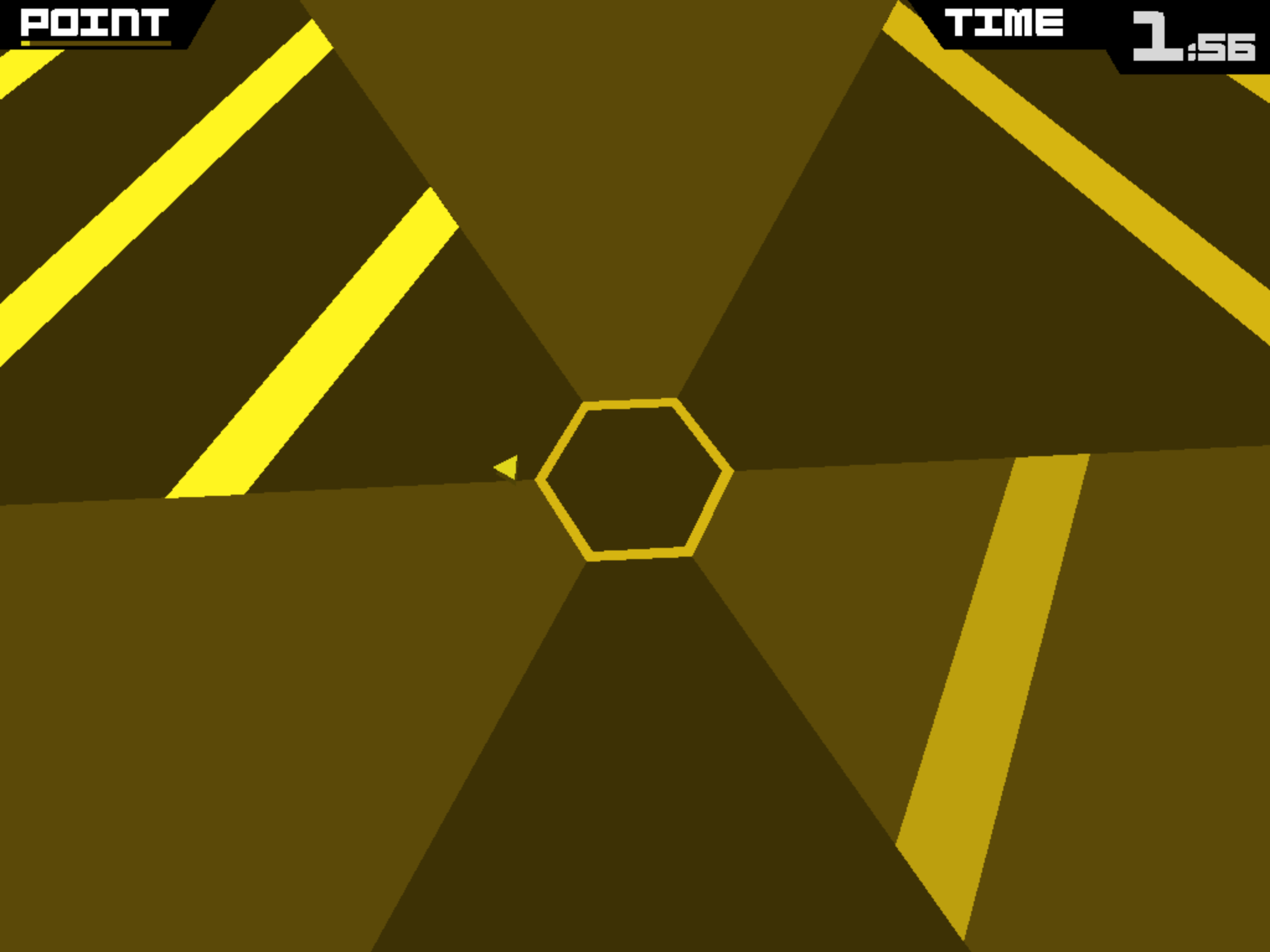 I’ve spent a sizable chunk of time over the past few days fatiguing my neurons with the iPad/iPhone game Super Hexagon. After finding it in the Impossible Games section of the iTunes Store with a high rating, I decided to spend the $2.99 and go go for it. Impossible indeed. For the first several attempts, I didn’t last more than 3 seconds; the little triangle I was trying struggling to keep from colliding into the lines closing in, that small shape near the center of the screen quickly crashed into the converging stripes as I dizzily fumbled with the controls. Since then, I’ve managed to make it through about 30 seconds of the game.